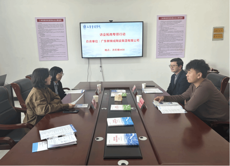 为推动2025届毕业生就业工作,搭建优质就业平台,近日,公司邀请广东新锦成陶瓷集团有限公司人才发展高级主管李广斌入校洽谈合作,公司党委副书记肖斯敏,市场营销教研室主任胡银花、辅导员雷巍参加此次洽谈。