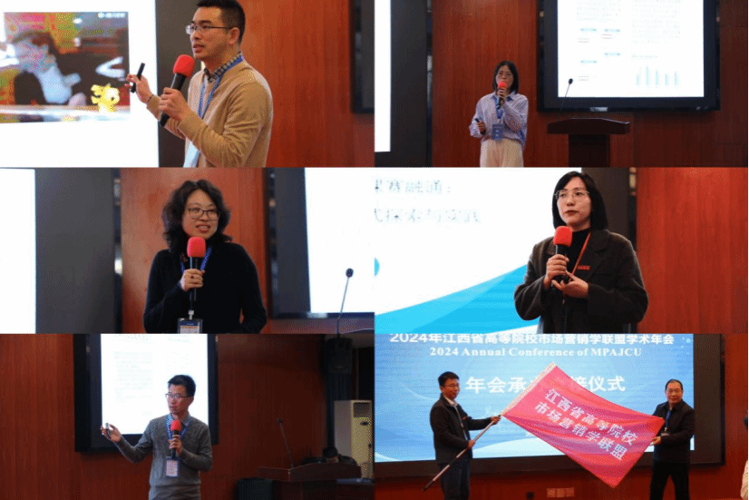 此外,东华理工大学经济与管理公司副经理赵建彬教授、江西财经大学市场营销系主任赵星副教授、景德镇陶瓷大学陶瓷数字经济产业公司执行副经理许剑雄副教授、珍岛集团院校事业部区域总监杜弦、公司pa娱乐游戏市场营销教研室主任胡银花副教授分别从市场营销学术研究、团队建设、专业建设、产教融合、人才培养等视角作了专题分享。新余公司和江西飞行公司分别作为今年新加入联盟的高校代表展示了新成员风采。最后,赣南师范大学经济管理公司副经理孙剑斌,代表下一届年会承办单位致闭幕词,并表达了对2025年江西省高等院校市场营销学联盟学术年会的期待。大会举行了下届年会的承办交接仪式。
