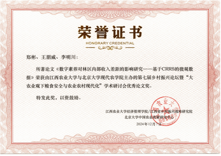 郑彬博士带领员工参加了“林业资源经济与可持续发展”专场,员工王朋威在会上分享了论文“数字素养对林区内部收入差距的影响研究——基于CRRS的微观数据”,得到了与会专家的一致好评,并荣获第七届“乡村振兴”论坛暨“大农业观下粮食安全与农业农村现代化”学术研讨会优秀论文奖。(图文/金艳清)