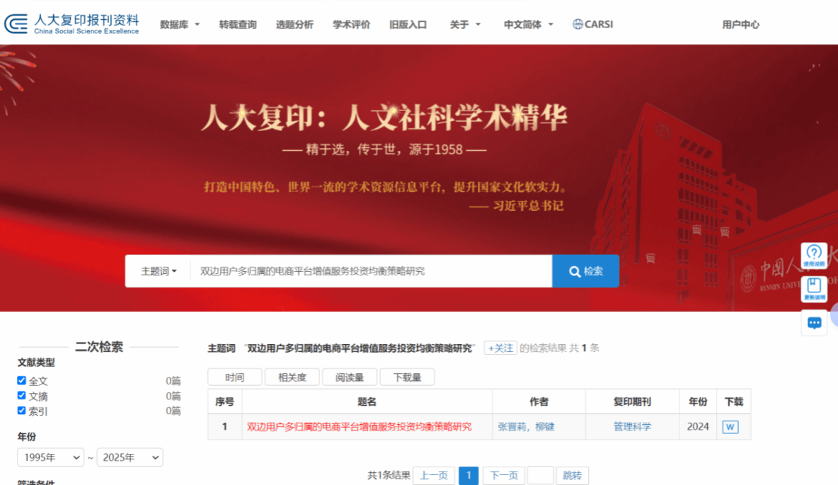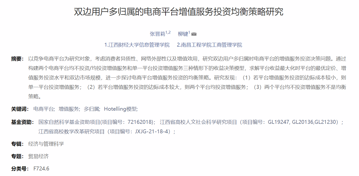 《科学决策》(2023年第12期)刊登了pa娱乐游戏张晋莉博士文章《双边用户多归属的电商平台增值服务投资均衡策略研究》。该文章于2024年被人大复印报刊资料转载。该论文针对电商平台的竞争问题,提出了平台增值服务投资策略。研究发现,平台投资会产生增值效用并增加成本,在一定的条件下会加剧或缓和了竞争,进而影响了增值服务投资策略。