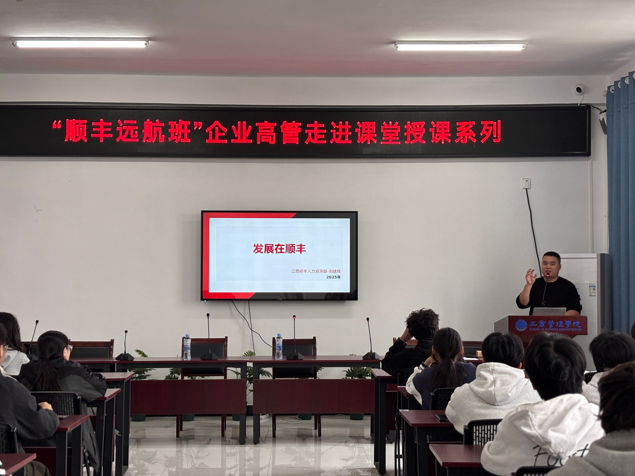江西顺丰速运有限公司人力资源经理刘建辉先生以“发展在顺丰”为主题,为同学们勾勒出一幅清晰的顺丰人才发展蓝图。他详细介绍了顺丰为员工设计的多元化职业发展通道和完善的培训体系,阐述了公司“以人为本”的人才理念,激发了同学们对未来职业路径的深入思考。