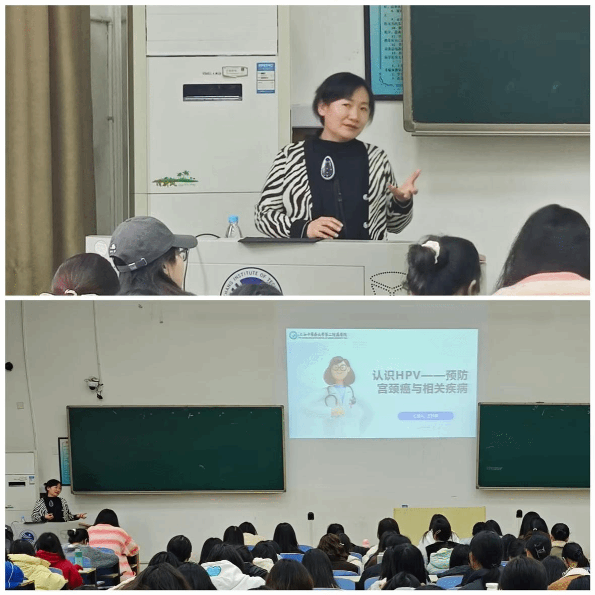 开讲前,王日霞副主任医师询问了同学们HPV疫苗的接种情况。开讲后,王日霞副主任医师从HPV的定义、特征、分型、传播与感染、预防等五个方面讲解,重点讲解HPV的传播途径、预防方法及如何选择宫颈癌疫苗。