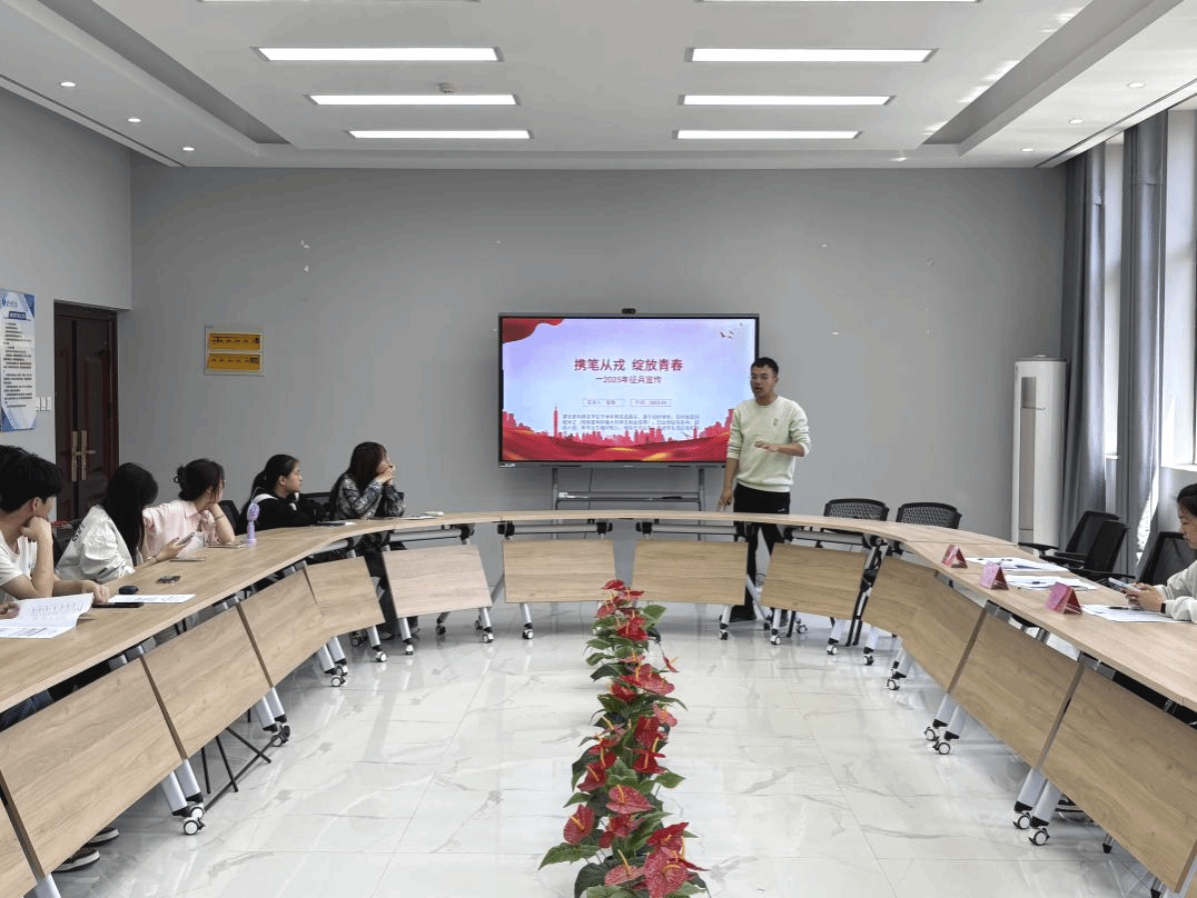 4月15日,公司在济民楼A421开展“携笔从戎,绽放青春”征兵宣传活动,2022级-2024级各班级负责人、院员工组织负责人、意向应征入伍的员工参加此次活动,活动由辅导员雷巍老师主持。