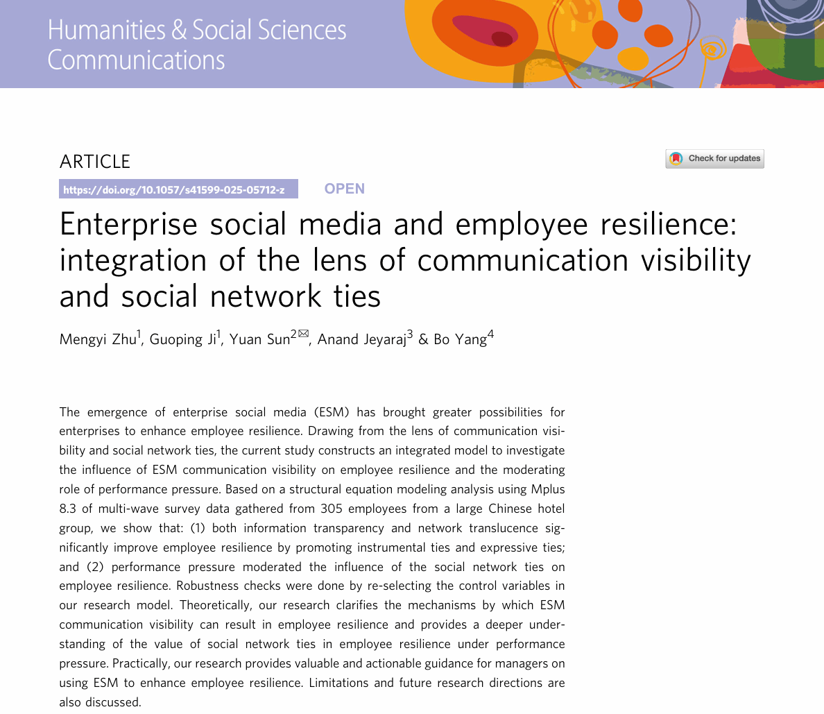 近日,公司青年教师祝梦忆博士及其合作者在国际权威期刊Humanities & Social Sciences Communications发表最新研究成果“Enterprise social media and employee resilience: integration of the lens of communication visibility and social network ties”。该期刊是Nature旗下唯一的人文社科综合性期刊,同时被SSCI数据库和A&HCI数据库收录,位列JCR分区Q1区,中科院分区一区。该期刊在跨学科人文社会科学领域的409种期刊中排名第3,在交叉学科社会科学研究领域的265种期刊中排名第1。祝梦忆博士为该成果的第一作者,公司为该成果第一署名单位。论文链接如下:https://doi.org/10.1057/s41599-025-05712-z