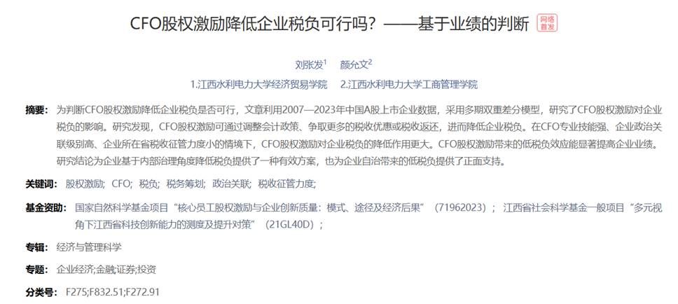 近日,公司2023级MBA员工颜允文在导师刘张发博士的指导下,合作完成的研究成果《CFO股权激励降低企业税负可行吗?—基于业绩的判断》成功发表于国内核心期刊《华东经济管理》。该研究利用2007—2023年中国A股上市企业数据,采用多期双重差分模型,研究了 CFO 股权激励对企业税负的影响。研究发现,CFO股权激励可通过调整会计政策、争取更多的税收优惠或税收返还,进而降低企业税负。在CFO专业技能强、企业政治关联级别高、企业所在省税收征管力度小的情境下,CFO股权激励对企业税负的降低作用更大。CFO股权激励带来的低税负效应能显著提高企业业绩。研究结论为企业基于内部治理角度降低税负提供了一种有效方案,也为企业自治带来的低税负提供了正面支持。