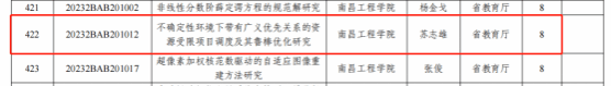 近日,江西省科技厅发布《关于下达2023年省级科技专项资金(科技计划第二批)项目的通知》,公司立项2项省自然基金项目,其中,物流管理教研室苏志雄博士的《不确定性环境下带有广义优先关系的资源受限项目调度及其鲁棒优化研究》获得了面上项目立项(资助经费8万),农林经济管理教研室李昌彦博士的《加强科研诚信和学风作风建设研究》获得了管理科学类(决策咨询)项目青年项目立项(资助经费10万)。