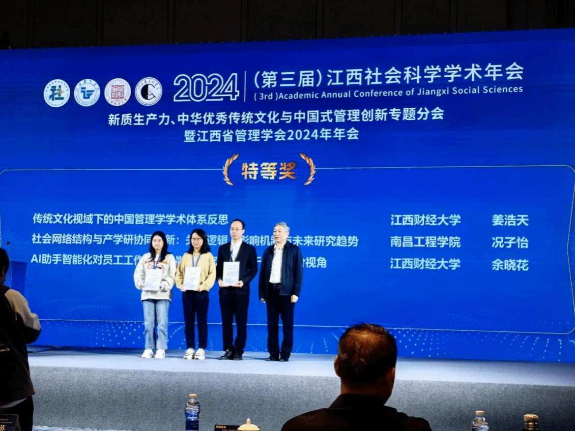 据悉,此次会议以新质生产力、中华优秀传统文化与中国式管理创新为主题,旨在落实国家创新发展的战略要求,为构建中国话语和中国叙事体系,讲好江西故事、发出江西声音贡献力量。年会共收到来自全国的83篇论文,经支持期刊双向匿名评审,最终评选出32篇年会优秀论文,其中,由唐厚兴,胡启帆两位导师指导,况子怡,张晔薇两位同学共同参与撰写的论文获本次年会优秀论文特等奖。此外,谭婷芝、颜允文两位同学也在平行论坛上进行了论文宣讲,展现了公司学子的学术风采。